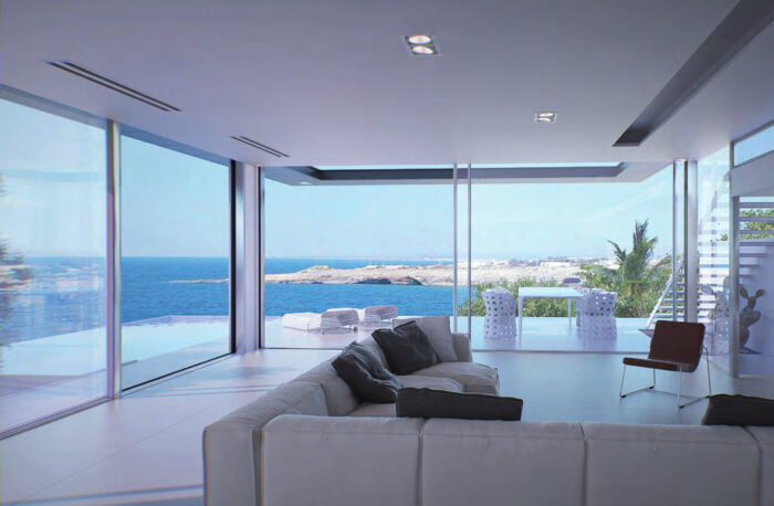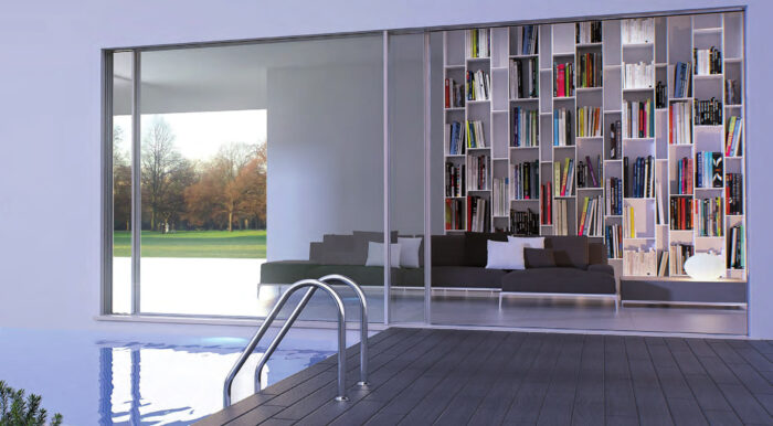I profili telaio possono essere integrati interamente nel pavimento, nel soffitto e nelle pareti laterali garantendo una soluzione di continuità e l’assoluta assenza di barriere architettoniche; l’anta si riduce ad essere una semplice cornice del vetro con uno spessore a vista di solo 10 mm.
